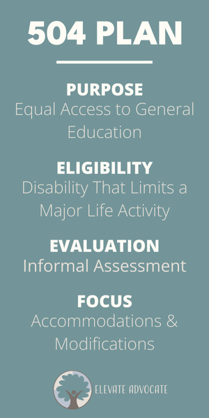 A 504 Plan comes from Section 504 of the Rehabilitation Act of 1973, which prohibits discrimination against individuals with disabilities in federally funded programs. The main purpose of a 504 Plan is to give students with disabilities equal access to education in the general classroom setting.